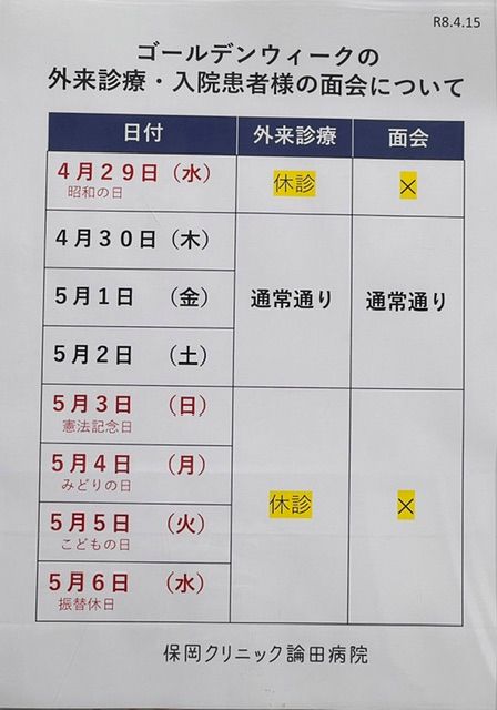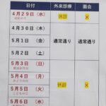 今年のゴールデンウイーク期間の診療日とご面会可能日について掲示します。