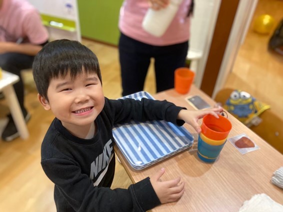 好きなジュースを自分で “選ぶ・伝える・量を決め注ぐ・運ぶ・飲む・下膳する・机を拭く”の一連の動作を用いて、意思決定・意思表示・またそれそれの動作に必要な目と手の協調性獲得を目指しています。